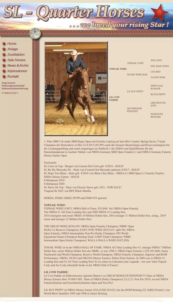 Sally was last years used as broodmare but she won SBH Regio Open with Grischa Ludwig 2015, was Champion of Broodmareshow Bitz and Reservechampion Ridingshow Bitz 2015 and is in DQHA Studbook 1 registered. She is 5-Panel N/N tested and not bred for 2024. Actual she has a black colt at side by REF Black Mamba which is not in the price included. Can be bred to stallion of your choice and is only for sale due to private circumstances and looking for a great new home. Easy breeder, sound, great moth