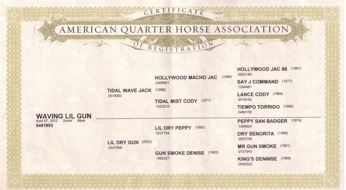 BROODMARE WAVING LIL G*N (*2012)-IN FOAL TO RUF LIL MAGNUM (3/4 brother to PATRIOT) for 2026. Big bones, great body & mind, by TIDAL WAVE JACK x LIL DRY G*N (earning & producing mare) x G*NSMOKE DENISE (produced 73k€). This Mare still has MR GUNSMOKE on her paper & produced i.a.♦ NRHA Fut. Austria NP L4 Finalist ♦ NRHA PreFuturity OP L2 Top10 Finalist ♦ NRHA Fut.Austria OP L1&L2 Finalist (would have been L3 Finalist, but was not nominated for) ♦ and more.5 Panel N/N. tiemann-performancehorses.de