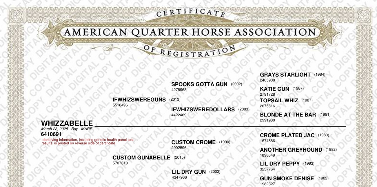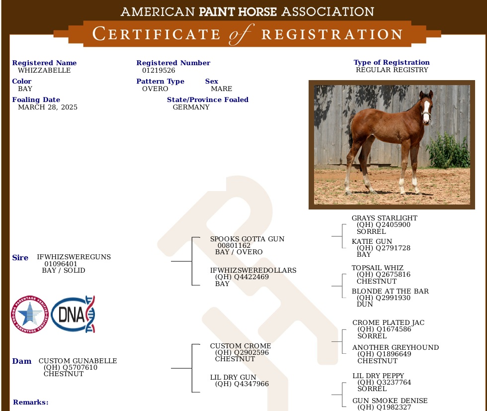 Filly 2025 by IFWHIZSWEREGUNS – Fullbrother in blood to NRHA $ 13 Mio Sire SPOOKS GOTTA WHIZ x Dam by NRHA $ 4 Mio Sire CUSTOM CROME ! Well built, super nice character – great pedigree – 5 Panel N/N, N/SW1, N/W20 – AQHA & APHA registered. Her Dam, Granddams, great granddams are all earning and/or producing mares! NRHA SSP Germany paid in, EURO NOMINATED, Eligible for the SilverSpurs 1 Million Dollar Challenge at the German, Italian, Austrian+Euro Futurity. tiemann-performancehorses.de